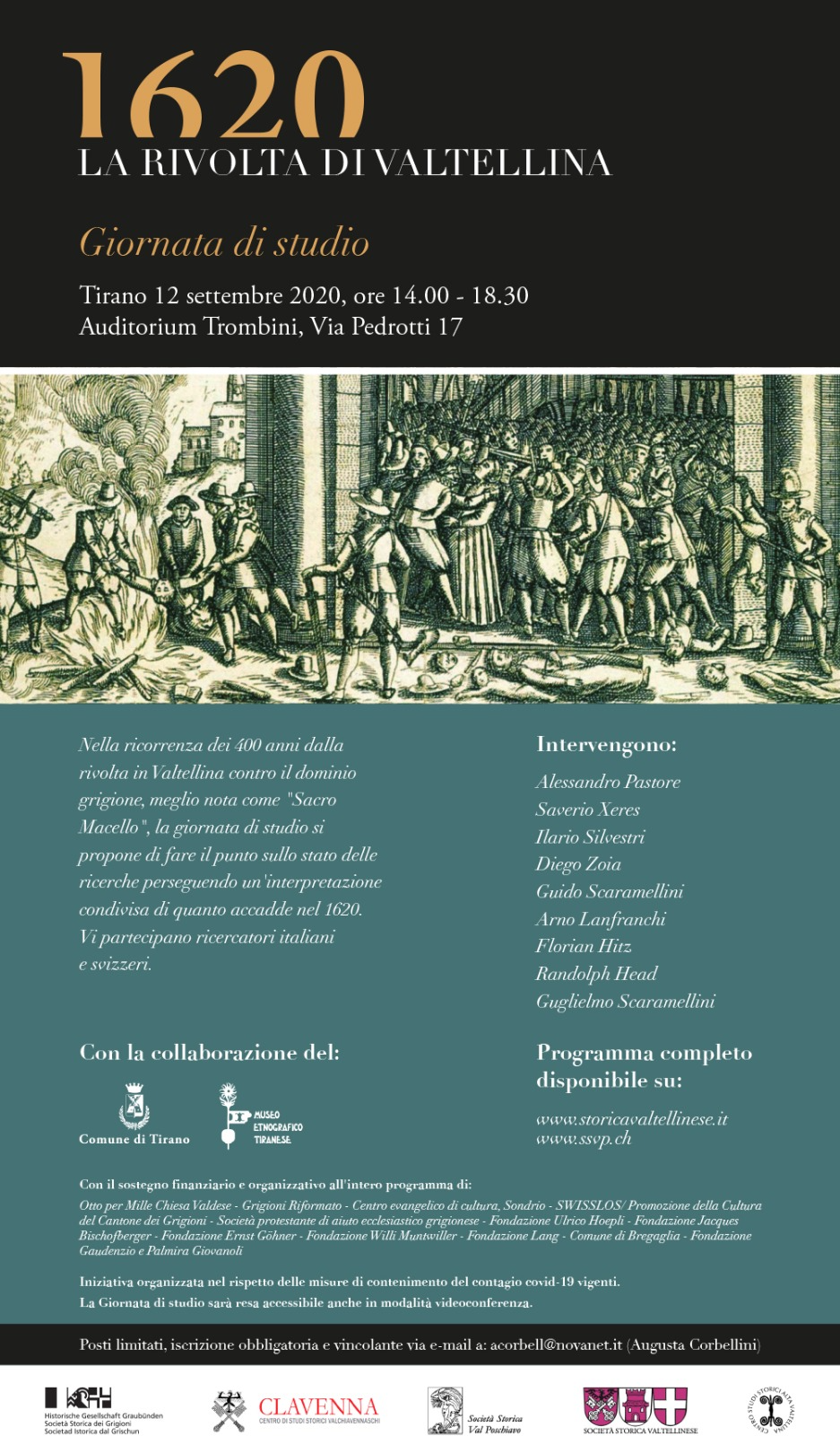 Locandina della giornata di studio “1620 La rivolta di Valtellina” dedicata al Sacro macello di Valtellina e tenutasi a Tirano (SO) il 12 settembre 20202 presso l’Auditorium Trombini.