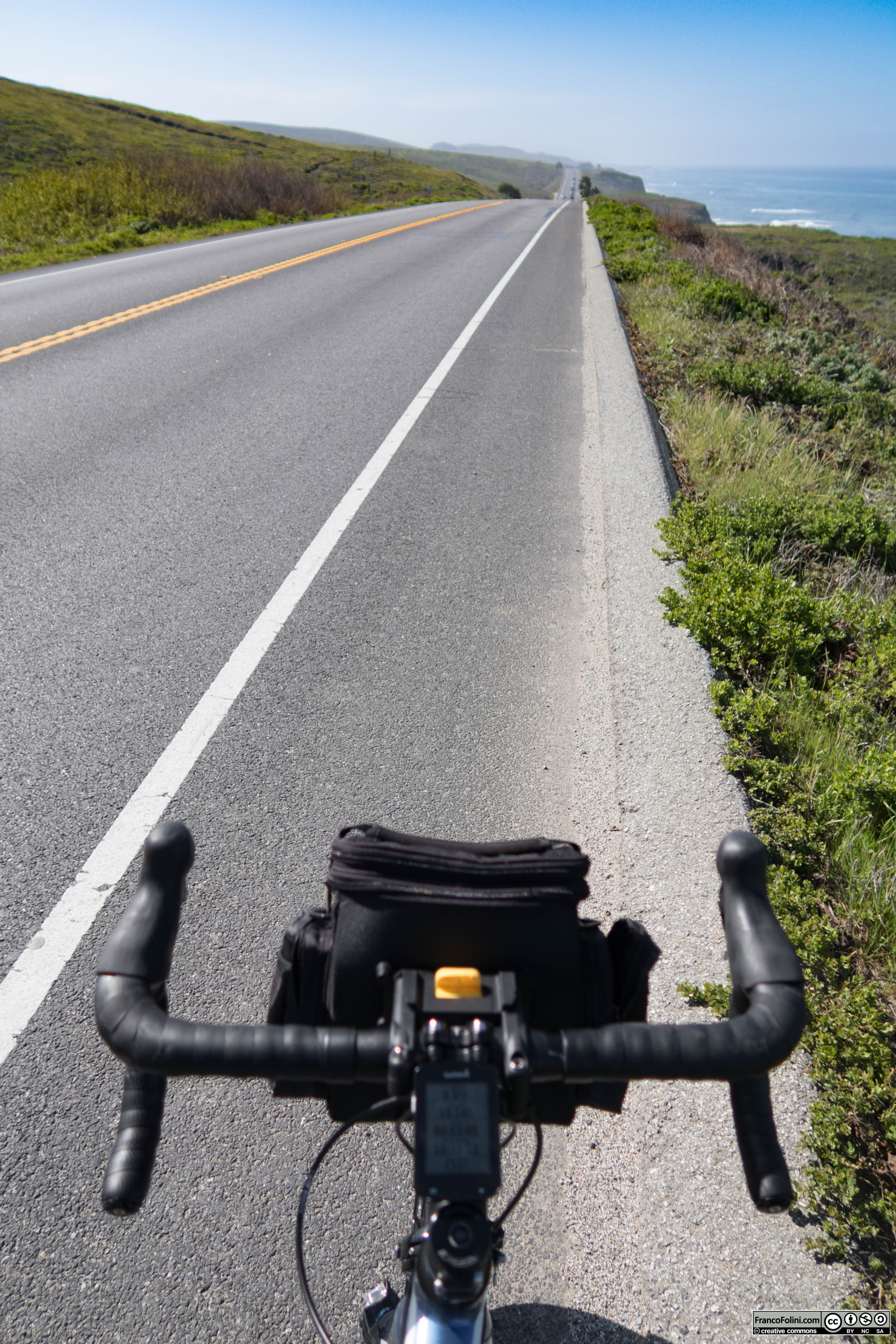 Foto scattata pedalando con l’intento di raccontare i piccoli ma continui saliscendi che caratterizzano questa strada costiera.