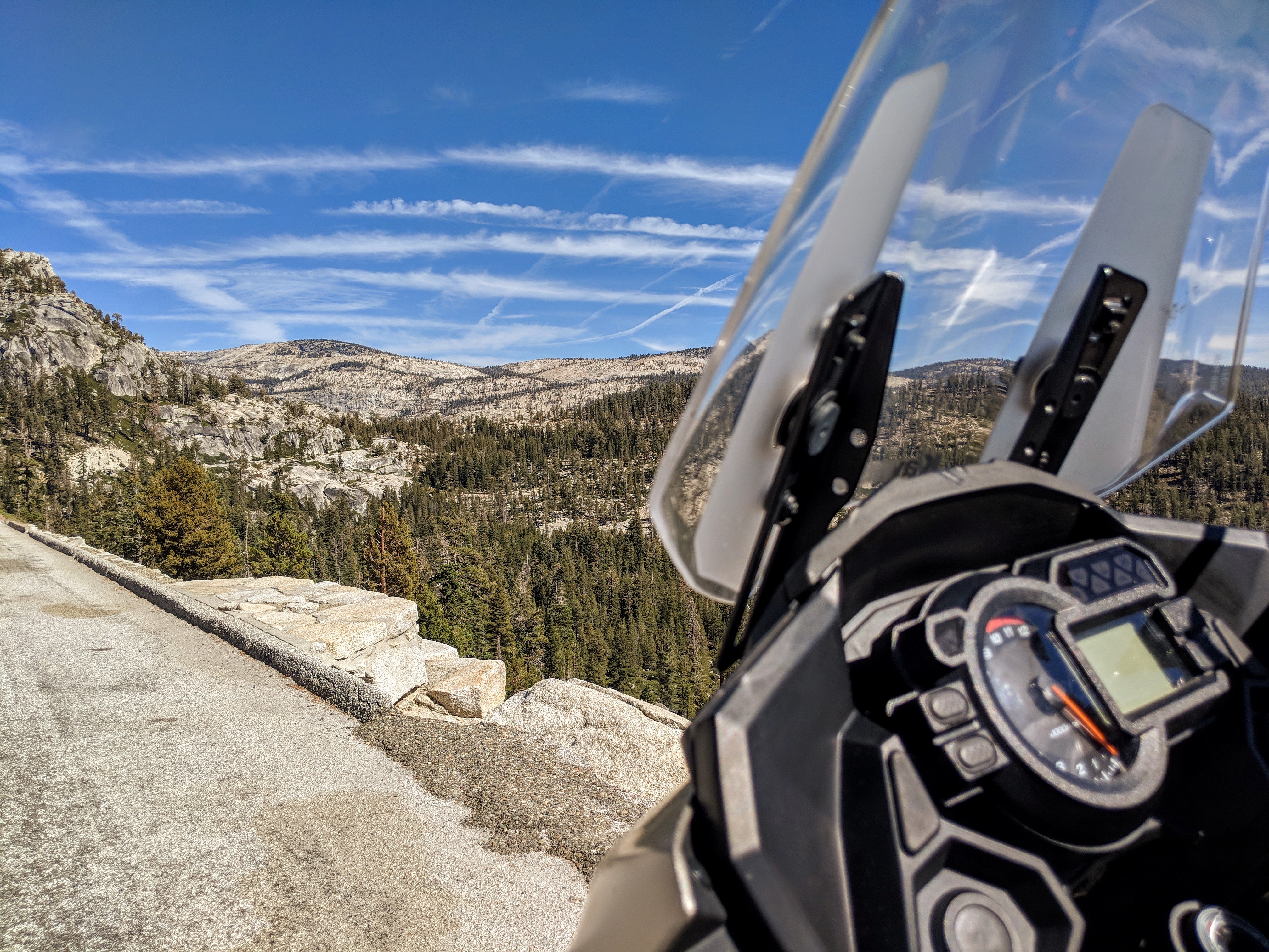 Il Tioga Pass si trova a 3031 metri di altitudine. In primo piano il cruscotto della Kawasaki Versys 1000 LT