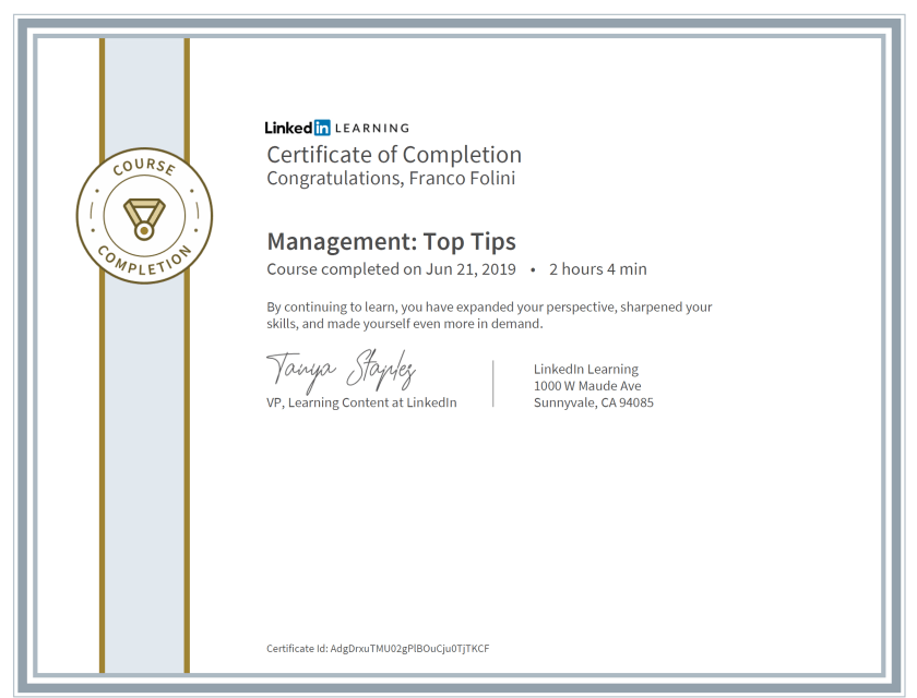 Today, I completed the LinkedIn certification “I got the LinkedIn Certification: Management, Top Tips.”