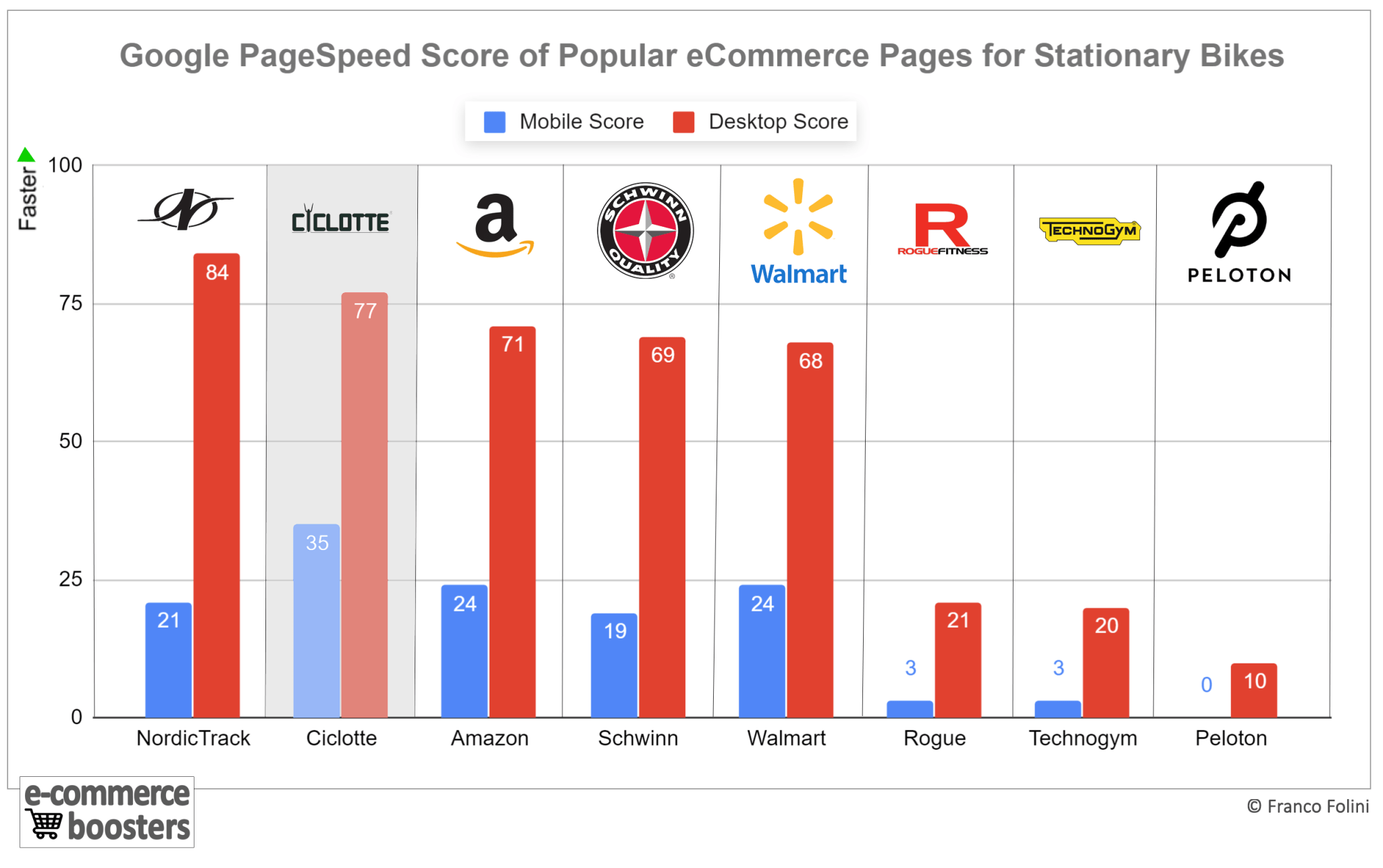 The set of brands and websites I selected is not intended to be complete or descriptive of the vertical market. Those are the top brands appearing on a Google Search when I run a search for “stationary bike.” The Score value generated by the test for each page summarizes the performance of the page. Every time you run the test, you can get a slightly different score, mostly based on time of the day and the server load. If you are interested in going deeper, I also included a table where, for each website, I listed the eCommerce platform used, the page tested. I determined the platform to the best of my knowledge. For each site, I recorded mobile data as well as desktop data. For both, I listed the general score, the FCP (First Contentful Paint) measured in seconds, and FID (First Interaction Delay) measured in milliseconds.