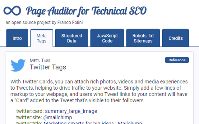 This tool looks at all Meta Tags on the head section of the page and groups them by category. The Meta Tags Report provides a detailed description of each meta tag type and links to technical documentation.