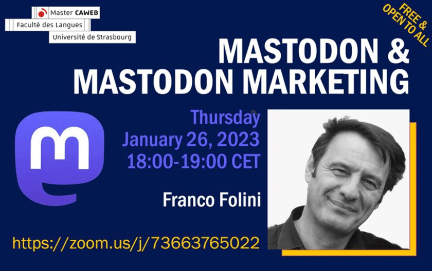 I’ve been invited by the Faculty of Languages of the University of Strasbourg to do an online presentation about Mastodon, the latest trendy social media platform. After Elon Musk’s recent acquisition of Twitter (now called X) and the following troubles, Mastodon has been promoted to the news headlines. In this presentation, I discussed Mastodon and why this is the best time to start a marketing presence. Mastodon is a growing social media platform that has become a credible and valuable competitor to Twitter. This is an excellent opportunity for marketers, but Mastodon must be approached respectfully and adequately regarding its specific culture and values.