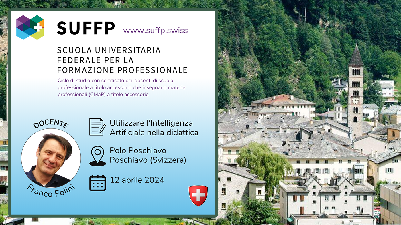 Oggi 12 aprile 2024 ho tenuto un corso presso il Polo Poschiavo di Poschiavo (Svizzera) sul tema dell’Uso dell’Intelligenza Artificiale nella Didattica.