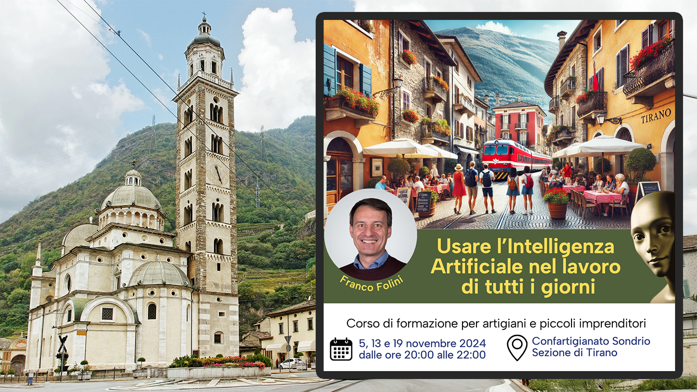 I giorni 5, 13 e 19 novembre 2024 ho tenuto il corso di formazione online “Utilizzare di strumenti di Intelligenza Artificiale nel lavoro di tutti i giorni” organizzato da Confartigianato Sondrio presso la loro sede di Tirano. Il corso si è sviluppato in tre serate in abbiamo analizzato vari scenari tipici di una azienda medio-piccola PMI italiana. Per ciascun scenario sono stati individuati dei processi o problemi che possono beneficiare di strumenti di Intelligenza Artificiale ed è stato proposto un utilizzo di strumenti come ChatGPT, Google Gemini, Claude, Perplexity, CoPilot, e MidJourney.