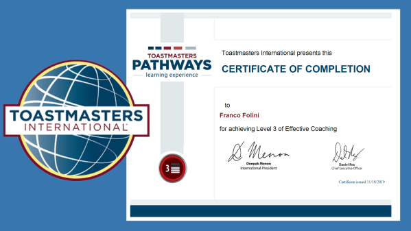 Today, I completed the Toastmasters training and received my "Certificate of Completion" for achieving Level 3 in Effective Coaching. This milestone reflects my dedication to improving my coaching skills and marks an important step in my personal development journey within the Toastmasters program.